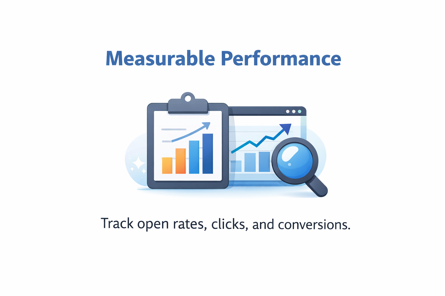Every campaign can be tracked through metrics like open rates, click-through rates, and conversions. These insights help improve strategy, refine messaging, and continuously optimize results.